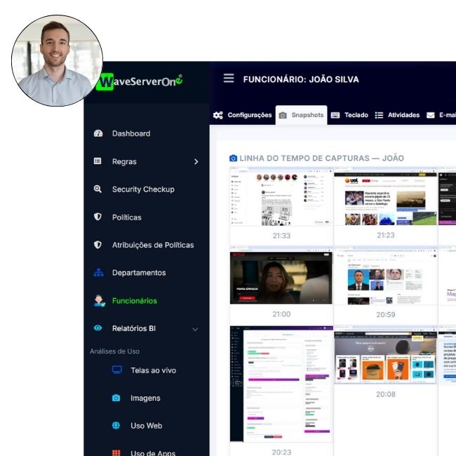 Acompanhe telas e atividades ao vivo, com precisão e total clareza.