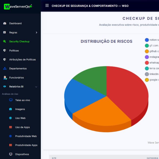 Relatórios, alertas, sites, aplicativos, produtividade, riscos e comportamentos aparecem direto no painel do WSO.