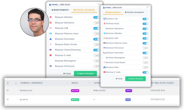 Controle acesso a sites, apps, dispositivos USB e comportamentos indesejados — tudo aplicado em segundos.
